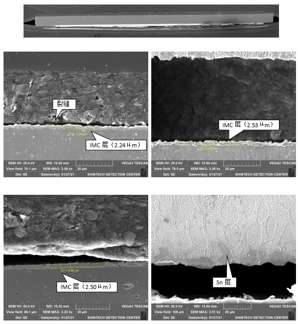 2. SEM分析发现:焊点断裂面位于Sn与pad侧的IMC层,断点在IMC层整体贯穿。IMC层整体连续、均匀,厚度2.0μm左右,状态良好。部分Sn面呈自然凝结弧状。