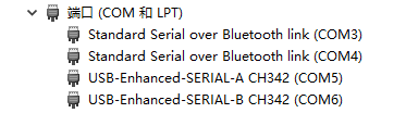 给开发板插上电源,Debug USB 链接笔记本,之后打开笔记本的设备管理器,在端口(COM 和 LPT)可以看到会多出来 COM5 和 COM6,选择串口连接COM5 (USB-Enhanced-SERIAL-A CH342 (COM5)),并设置速度为 115200。