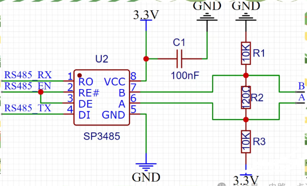 自动收发电路相较于普通的485电路,其关键差异在于增加了一个晶体管来控制485的使能引脚。设计中,R9限流电阻通常取值为4.7K,而R8上拉电阻也设定为4.7K,以确保在晶体管未导通时,使能引脚能够被有效上拉。这样的设计使得电路能够根据需要自动切换收发模式,提高了数据的传输效率与灵活性。