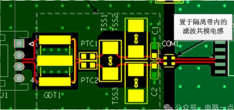 L1作为共模电感,其核心作用是衰减共模噪声并增强电路的抗干扰能力。在选择时,通常考虑120Ω/100MHz的规格。而C3电容则主要用于隔离接口地与数字地,以防止潜在的干扰,其值一般选为1000pF。为了确保电磁兼容性(EMC)达到高标准,即差模信号能够承受2kV的冲击,共模信号能抵御6kV的干扰,我们在接口处精心设计了由气体放电管、热敏电阻和TVS管共同组成的防护电路。