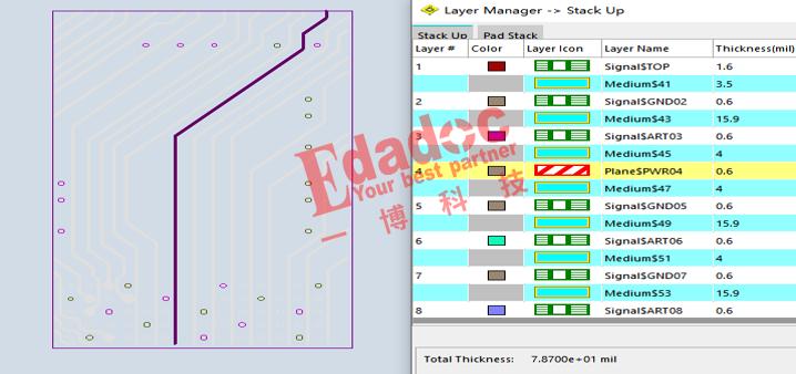 我们先来看看阻抗的情况,这根地址信号的走线是要求按40欧姆来设计,经过仿真后,我们看到上下都是地平面设计的阻抗仿真结果非常接近40欧姆走线阻抗。