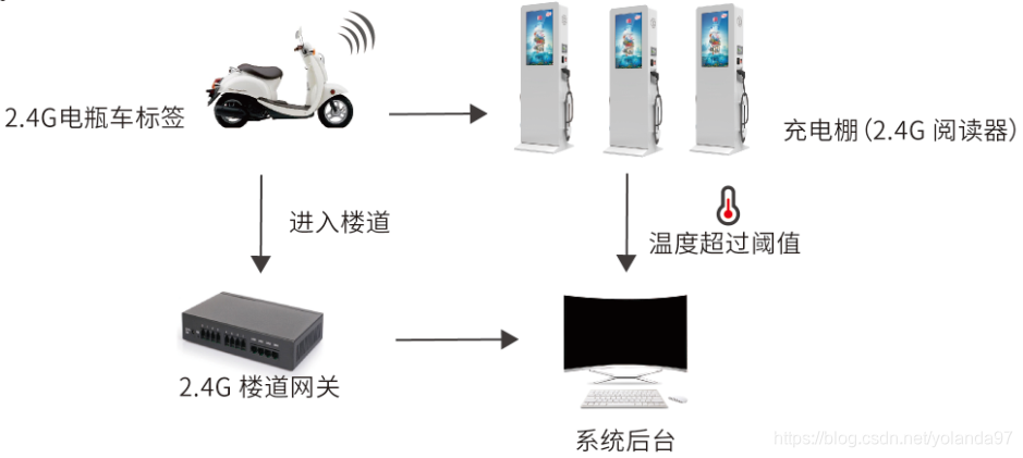 为方便小区管理,电瓶车和车主信息绑定在一起,RF标签是安装在电瓶上的,标签设置温度阈值,当 电瓶温度超过设置阈值时报警,当充电棚的阅读器接收到报警信息后,上传至后台,通知后台管理人员前往报警处查看;楼道中安装2.4G网关,如果检测到电瓶标签进入到楼道,发出报警,并通知后台管理人员。