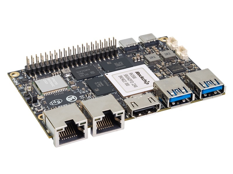 香蕉派BPI-M7采用瑞芯芯片RK3588, 8/16/32G,RAM 64/128G eMMC,支持wifi6。2x2.5G端口,1xHDMIout,2x USB3.0,2xTYPE-C,2x MIPI CSI接口和1x MIPI DSI接口,1x M.2 KEY M接口,40 PIN GPIO,迷你尺寸仅为92x62mm。