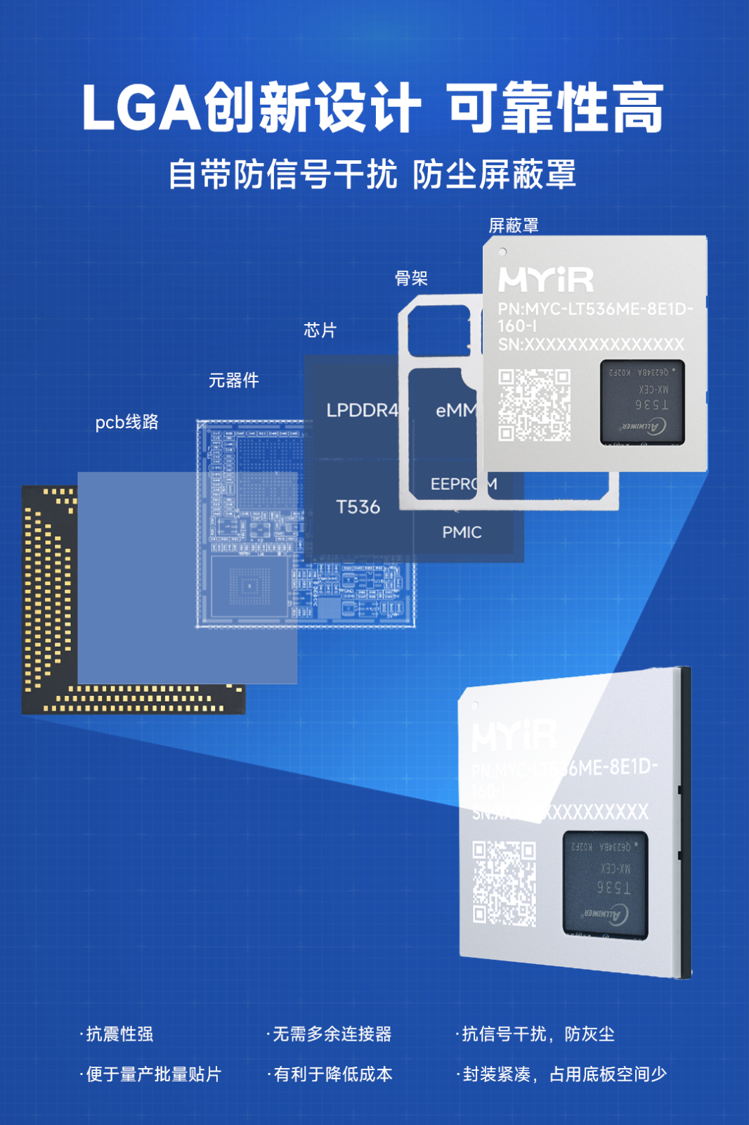 在智能制造与物联网技术日新月异的今天,一款集高性能、低功耗、高可靠性于一身的工业级核心板成为了推动产业升级的关键力量。米尔电子向市场推出——国产真工业级四核Cortex-A55米尔全志T536核心板,助力国产真工业级工控板快速发展,为工业自动化、工业控制、机器人等领域提供强大的算力支持。MYC-LT536系列核心板采用LGA封装,存储配置2GB LPDDR4、16GB eMMC、接口丰富。