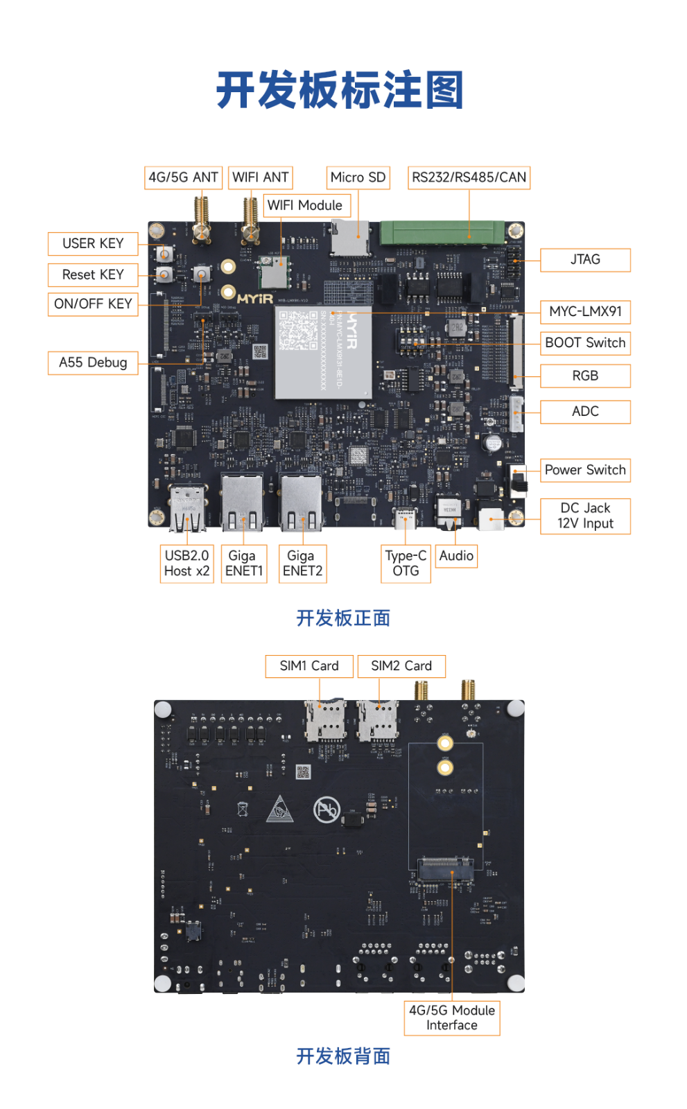 MYD-LMX91开发板,采用 12V/2A 直流供电,搭载了2路千兆以太网接口、1路M.2 B型插座的5G/4G 模块接口、板载1路 WIFI模块、1路 RGB 显示接口、1路音频输入输出接口、2路USB HOST Type A、1路USB OTG Type-C接口、1路Micro SD接口、1路CAN由凤凰端子引出、1路RS485由凤凰端子引出、1路RS232 凤凰端子引出,1路JTAG调试接口,1路ADC接口。