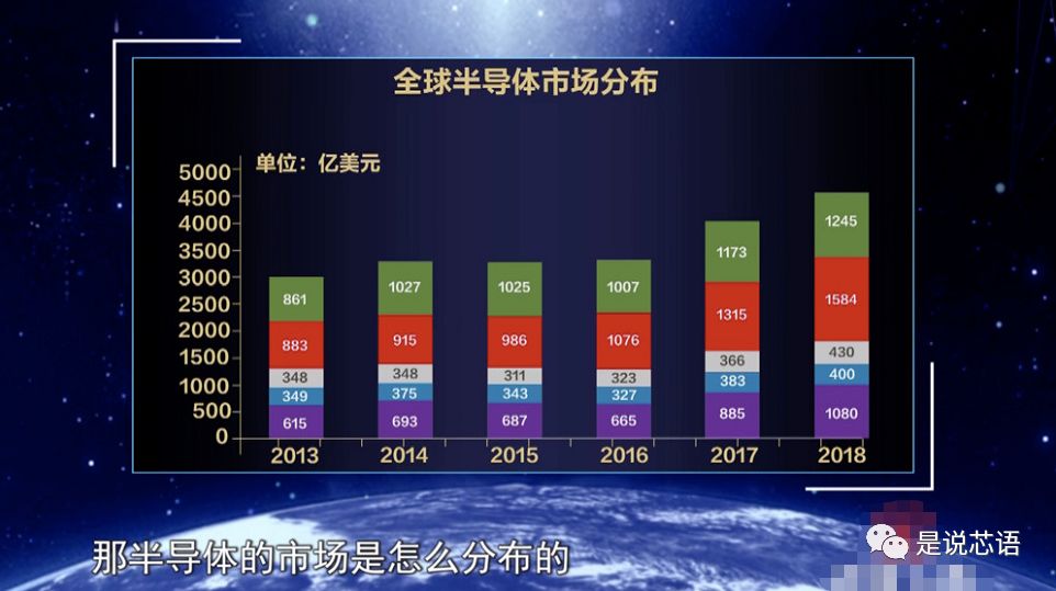那半导体的市场是怎么分布的?我们看到红色的是中国,最下面这个紫色是美洲的市场,蓝色的是欧洲市场,灰色的是日本市场,上面的绿色的是除了中国和日本之外的亚洲其它市场。这个数字有点惊人,因为中国市场占了全球市场的34% ,1584亿美元,超过三分之一,这是指中国市场用到的。同时,2018年中国也是增长最快的半导体市场,中国半导体市场增长了20.5%。我想大家可以想象中国要买多少集成电路,很多!