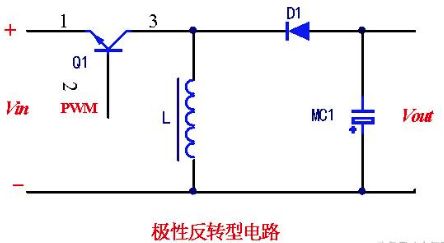 如下图为极性反转型电路,也叫倒置型电路。当Q1导通时,uin加在l两端,产生电流和储存能量。Q1截止后,l上的电流经二极管D1给电容器MC1充电。由此产生与输人电压极性相反的输出电压。