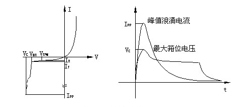 但这条曲线只反映了TVS特性的一个部分,还必须补充右图所示的特性曲线,才能反映TVS的全部特性。这是在双踪示波器上观察到的TVS管承受大电流冲击时的电流及电压波形。
