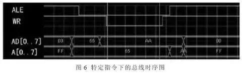 从图6 中可以看出,P0 口先送55H,在ALE 下降沿实现地址锁存,随后送出数据0AAH,在WR 有效( 低电平) 期间锁存器输出低8 位地址55H,P0 口送出数据0AAH。