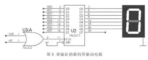 WR 与A8( P2.0) 相或提供74LS273的时钟信号,当执行“MOVX @DPTR,A”指令时,地址信息由DPTR 寄存器确定,会出现有效的写信号WR,只有当地址A8 为满足“0”时,写信号才可以作为74LS273 的时钟信号输入,完成数据锁存。