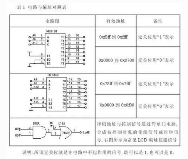 RS、RW 分别接A12、A13,使能信号编址为Y7,这样LCD 的四个驱动地址( 数据读写和命令读写) 为0CFFFH 到0FFFFH ( 无关位为1) 或者8700H 到0B700H( 无关位为0)。