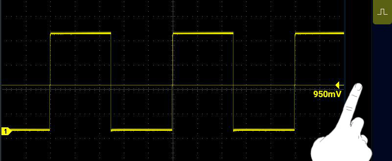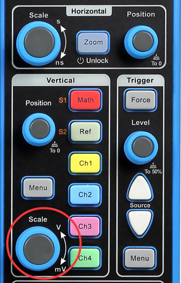 垂直方向上太大,那么我们就要使其缩小;垂直方向太挤,我们就要使其展开。如下图所示触屏操作或转动旋钮即可,此按钮专业术语叫垂直档位,控制的是纵坐标上一格的电压值。