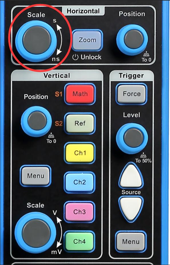 水平方向上太大,那么我们就要使其缩小;水平方向太挤,我们就要使其展开。如下图所示触屏操作或转动旋钮即可,此按钮专业术语叫时基,控制的是横坐标上一格的时间。