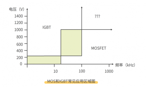 也可从下图看出两者使用的条件,阴影部分区域表示 MOSFET 和 IGBT 都可以选用,“?”表示当前工艺还无法达到的水平。