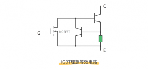 IGBT 的理想等效电路如下图所示,IGBT 实际就是 MOSFET 和晶体管三极管的组合,MOSFET 存在导通电阻高的缺点,但 IGBT 克服了这一缺点,在高压时 IGBT 仍具有较低的导通电阻。