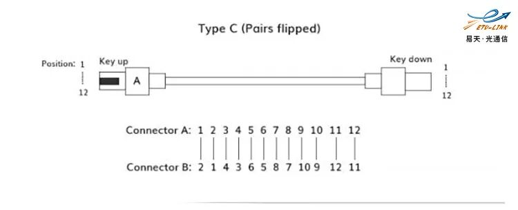 3、Type C(成对交错型):C型的MPO跳线是相邻的一对纤芯位置交叉,即一端的纤芯1对应另外一端的2,一端的纤芯12在另外一端是11。两端的Key键朝向也是相反的,key up 对应 key down。