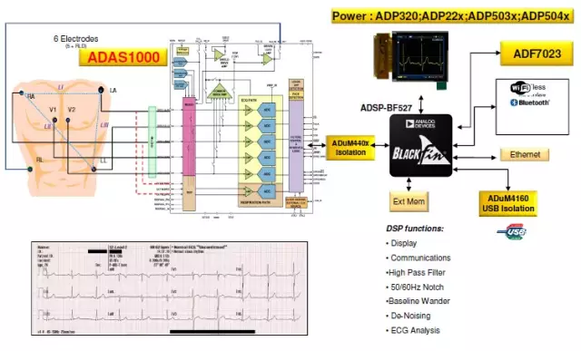 ADAS1000能够测量心电图(ECG)信号、胸阻抗、起搏伪像、导联连接/脱落状态,并将此信息以数据帧的形式输出,以可编程数据速率提供导联/矢量或电极数据;具有低功耗和小尺寸特性,适合电池供电的便携式应用;还是一款高性能器件,因此适用于高端诊断设备。