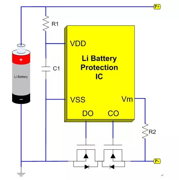 锂电池保护电路由保护IC及两颗功率NMOS构成。当P+/P-端连接充电器,给电池正常充电时,两颗NMOS均处于导通状态;若保护IC检测到过度充电等充电异常时,保护IC的CO会从高电平跳变为低电平,控制充电MOSFET关断,切断充电回路。当P+/P-端连接负载,电池正常放电时,外接NMOS依然处于导通状态;当出现过度放电或放电过流等等放电异常时,保护IC的DO会从高电平跳变为低电平,关断放电MOSFET关断,放电回路被切断。
