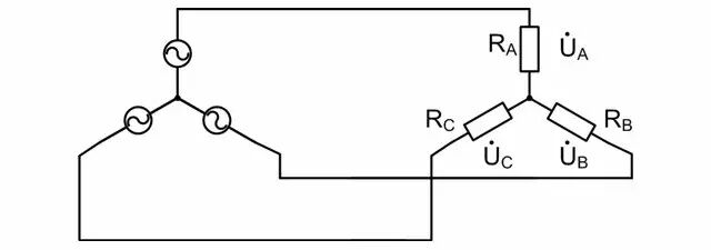 同样的电源,负载Y形连接,不引出中性线。与工况一相比,线电压和线电流完全一致,但负载不同,假设存在一种情况,A相负载电压幅值减少一半,方向不变,如图3所示,右方虚线为工况一的相电压,工况二的相电压起点由正三角形重心往上移。(有别于工况一的相量以小写下标表示)。