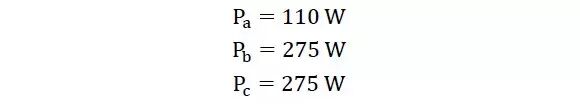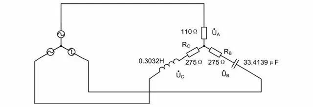 在50Hz情况下,求得A相负载为110Ω电阻,B相为275Ω电阻与33.4139μF电容串联,C相位275Ω电阻与0.3032H电感串联。