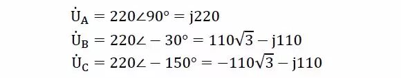 电源为三相Y连接,电源相电压幅值为220V。每相负载为220Ω电阻,Y形连接,不引出中性线。