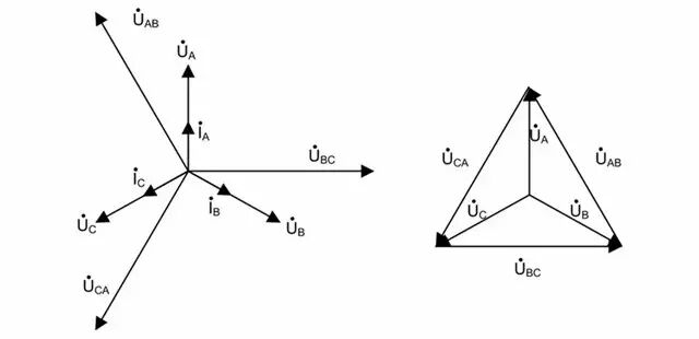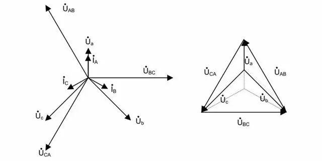 显然这种情况下负载是平衡的,负载上相电压滞后线电压30°,相电压与相电流一致,如图2所示。线电压平衡,其相量可围成正三角形,相电压也平衡,因此从正三角形重心引向各顶点的相量即为相电压。