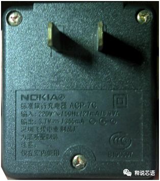 笔者最早接触的充电器是儿时随身听大块头充电器,其内部是一个工频变压器加整流桥和平滑电容,内部都不带有稳压器的,别问我是怎么知道的。在那时觉得这是一个极其神奇的存在,可以取代电池,要知道,那时候的电池用不了多久就光荣退休了。笨重,构造简单同时也可靠耐用。NOKIA早期的充电器就是这种原理,输入为220VAC 50Hz输出为3.7VDC并提供最大355mA的充电电流,输出功率仅1.3W。充电线和充电器是一体的,而充电口也是圆形的,虽然输出功率不大,可是块头却很大。不过对于当时几百几百毫安时的手机电池足够了。