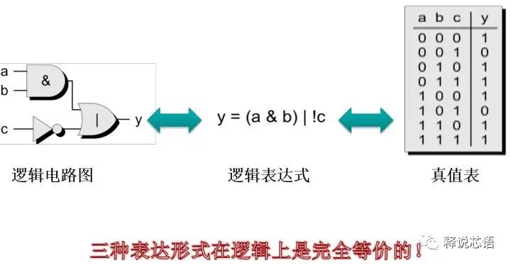 逻辑电路图、逻辑表达式和真值表三者在逻辑上是等价的。这种等价的意义何在呢?因为数字电路/数字系统的理论基础就是布尔逻辑。无论是ASIC形式的数字集成电路也好,还是基于FPGA的设计也好,在绝大部分时候就是在实现各种逻辑表达式。因此任何有能力实现逻辑表达式的方式仅从功能上来说都是等价的。