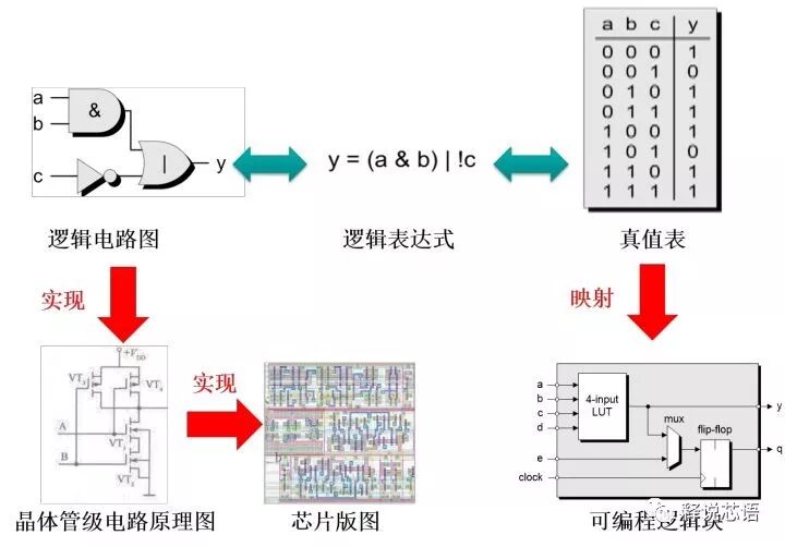 逻辑电路图可以进一步细化为晶体管级的电路原理图,而晶体管级的电路原理图经过物理设计又会得到可以用于去加工制造的芯片版图。如果把这个芯片加工出来,这最红得到的版图就是对应的逻辑电路图的功能,也就是对应了想实现的逻辑表达式。把真值表映射到一个FPGA内部的可编程逻辑块,通过确定输入输出关系通用也可以实现相同的逻辑表达式。