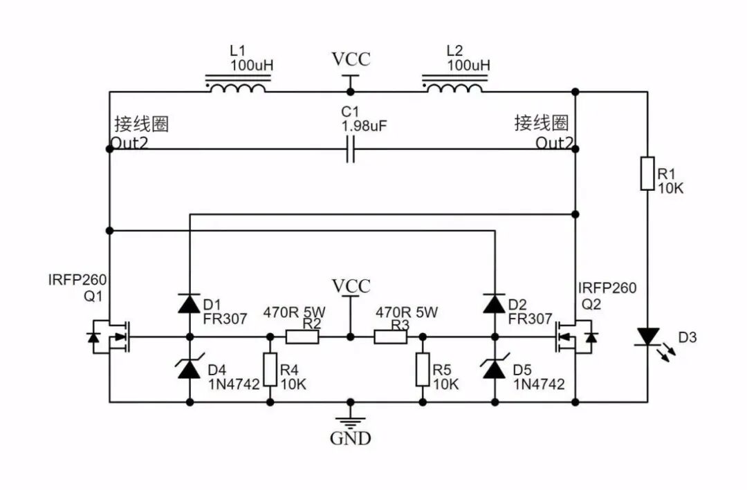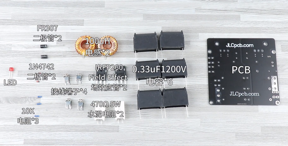 0.33uf 1200V电容*6, 100uh电感*2,IRFP260场效应管*2, 470Ω5W水泥电阻*2,FR307二极管*2, 1N4742二极管*2, 10K电阻*2,LED,接线端子*4, 48V20A开关电源,铜管。