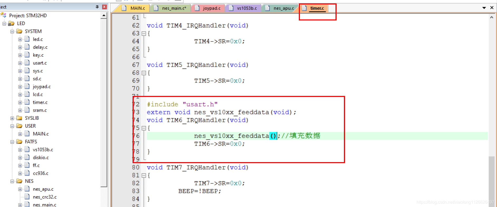 nes_sound_open函数里初始化了VS1053音频设备,然后开启了定时器中断,使用定时器去调用VS1053的播放接口,在定时器中断服务器函数里完成声音数据的输出,这里声音是存放在一个全局缓冲区里,后面游戏在主循环里运行的时候会不断的向这个缓冲区填数据,定时器超时进中断就查询是否有音乐可以播放,有就播放,没有就出来。