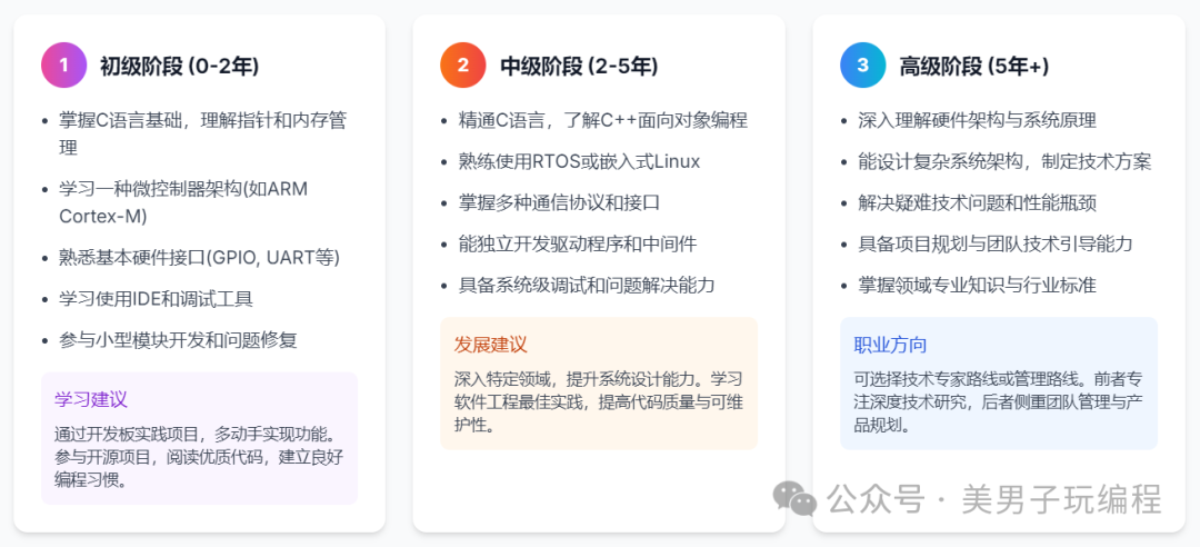 具备强大的分析和解决复杂问题的能力,尤其是在软硬件交织的场景下。能够编写清晰、规范的技术文档,如设计文档、接口文档、用户手册等。良好的文档是项目成功的关键。能够与团队成员(硬件工程师、测试工程师、项目经理等)有效沟通和协作。嵌入式技术发展迅速,必须保持好奇心,持续学习新技术、新工具、新标准。阅读专业书籍和技术文档是重要途径。了解项目开发流程,具备基本的进度管理和风险意识。遵循编码规范,编写高质量、可维护的代码。