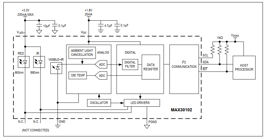 总结起来,MAX30102 传感器利用光吸收和反射的原理,通过测量血液中的氧气饱和度来实现非侵入式的心率监测和血氧饱和度测量。 MAX30102 是一个集成的脉搏血氧仪和心率监测仪生物传感器的模块(芯片)。它集成了一个 660nm 红光 LED、880nm 红外光 LED、光电检测器、光器件,以及带环境光抑制的低噪声电子电路。