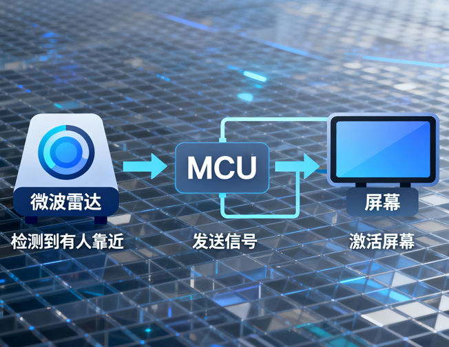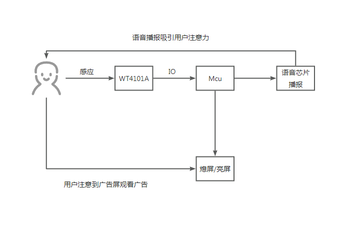 基于以上问题,我们根据微波雷达的感应唤醒特点,结合语音提示器的功能特性,设计一款人来感应唤醒屏幕同时播报语音提示。