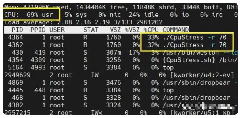 使用C语言编写模拟CPU压力测试程序,通过命令行参数指定CPU的负载率,并在一定的时间跨度内持续运行,以模拟CPU的高负载状态。程序通过使用循环和休眠来控制CPU的负载率,并在循环中通过获取当前时间戳来计算CPU的使用时间和空闲时间。程序会一直持续运行,直到手动终止。其评估板运行CPU压力测试程序后如所示。