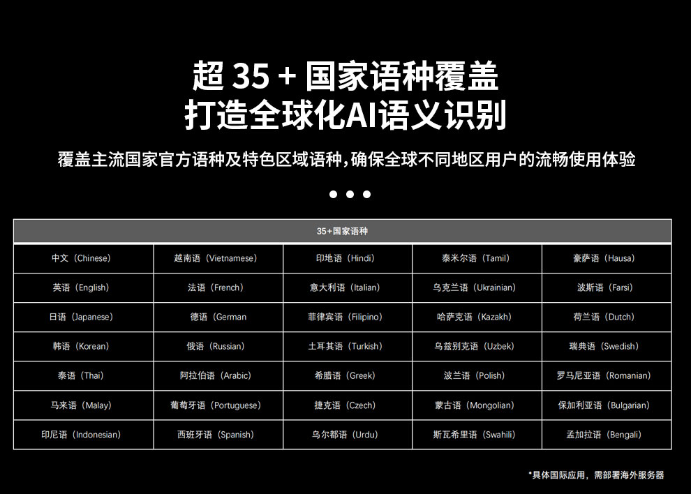 一套芯片+AIoT平台搞定全球化部署,覆盖英语、日语、韩语、泰语、阿拉伯语等35+国家语种。