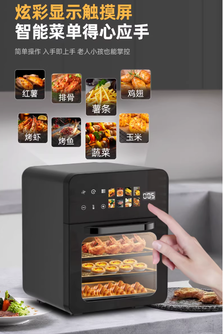 智能空气炸锅上,菜单不再是密密麻麻的文字列表,而是一张张高清的食物缩略图——薯条、鸡翅、蛋糕,像在浏览美食App一样选择。启动之后,屏幕上的热量扩散动画和倒计时同步出现,翻面的时候有专属提醒动画,完成的时候有庆祝动画。做饭这件事,突然就有了仪式感。