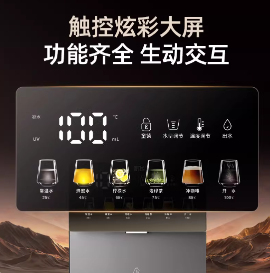 净饮机上,当你调节水温,屏幕的背景色会从冰蓝色平滑过渡到炽红色,温度不再是一个冷冰冰的数字,而是一种可以被眼睛感受到的"温度感"。滤芯快到更换时间了?不是简单的一个百分比,而是一颗水滴图标从饱满逐渐变得干瘪——用户一眼就懂,不需要任何说明书。